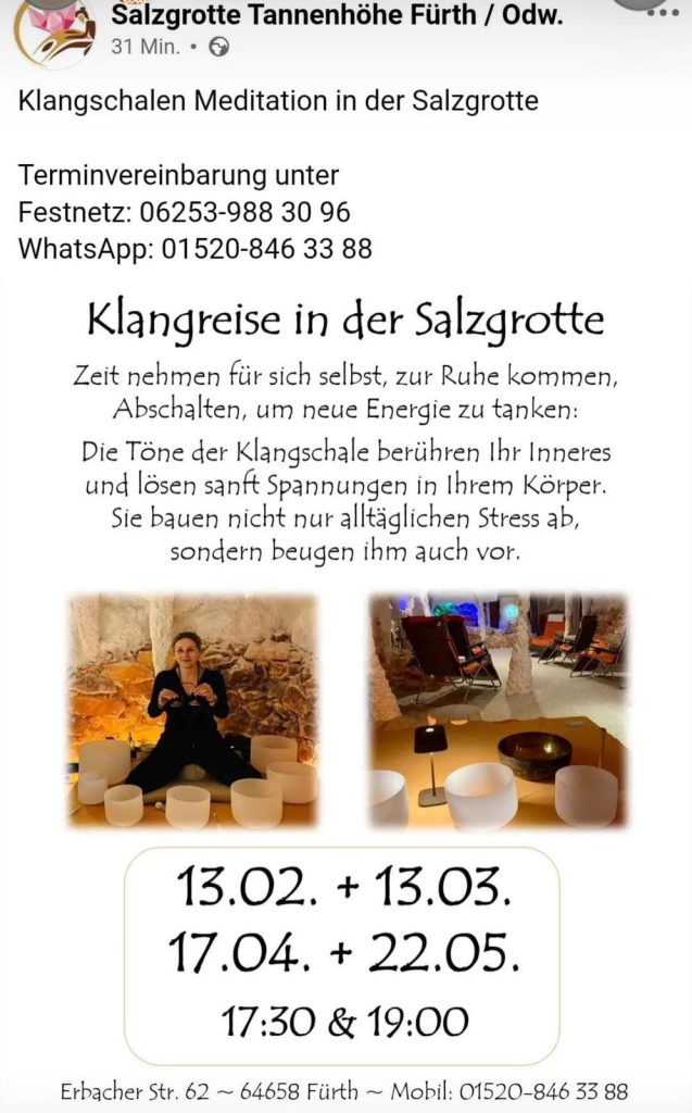 In der besonderen Atmosphäre der Salzgrotte verbinde ich sanfte Klänge von Klangschalen mit der heilsamen Kraft salzhaltiger Luft. Umgeben von warmem Licht, schimmernden Salzkristallen und einer wohltuenden Stille darf dein Nervensystem zur Ruhe kommen und dein Atem ganz natürlich tiefer werden.
